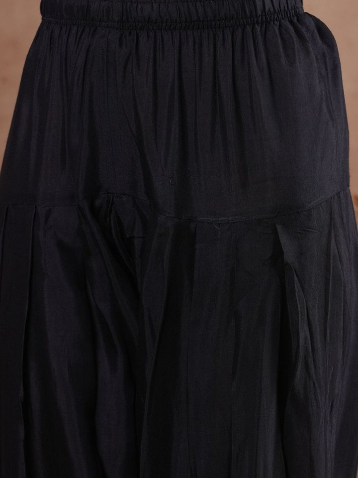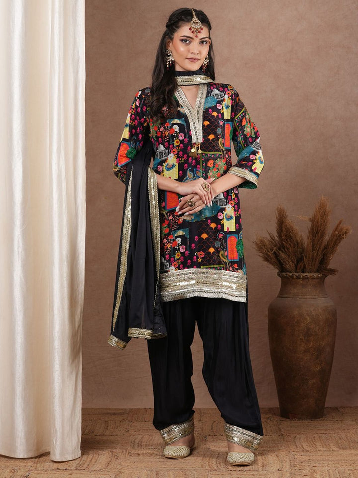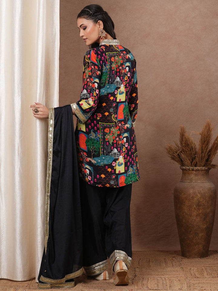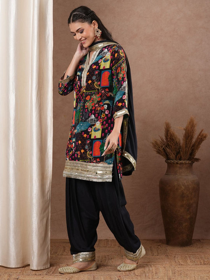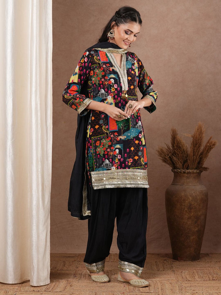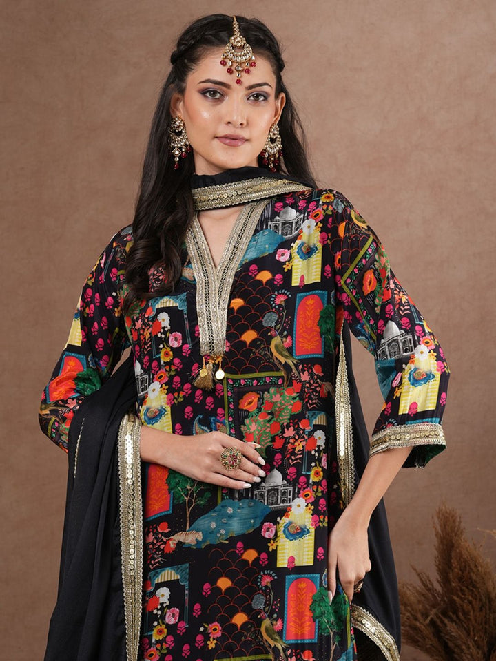 Abstract Floral Printed Straight Kurta with Pant & Dupatta - Black (Set of 3)