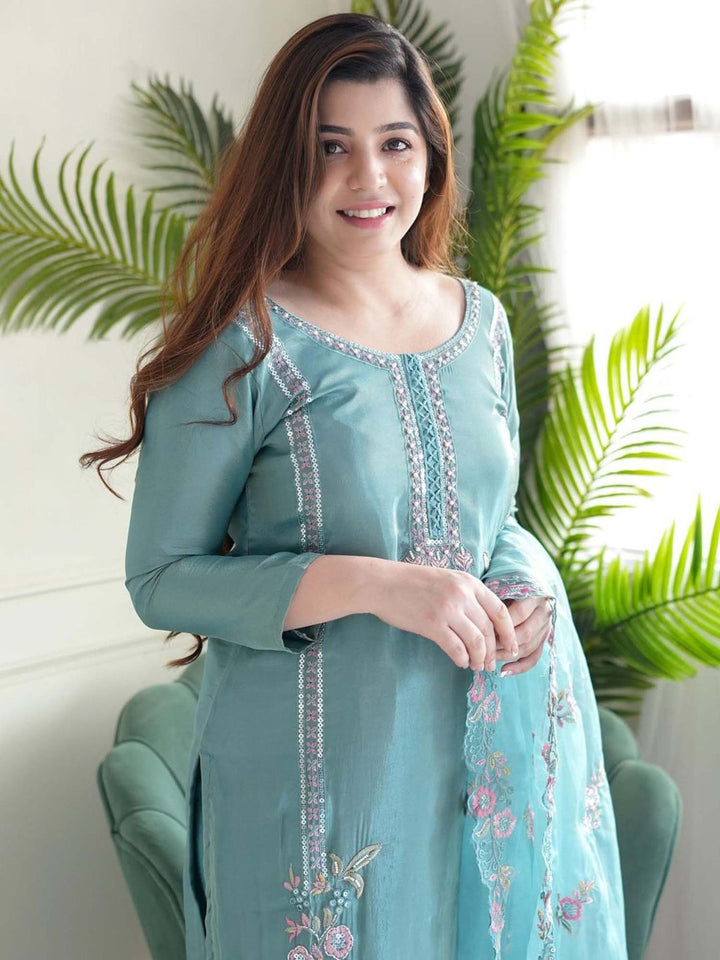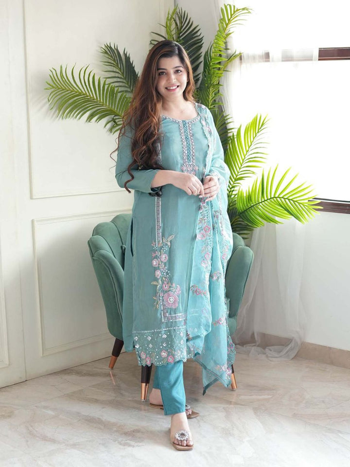 Blue Round Neck Kurta With Pant & Dupatta