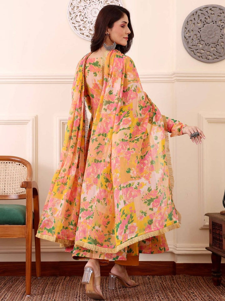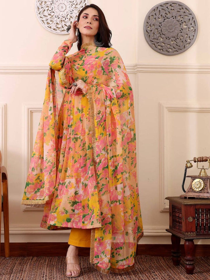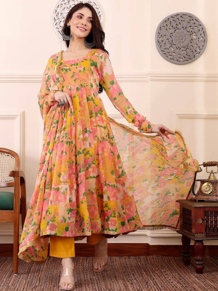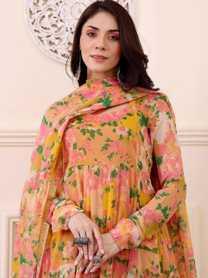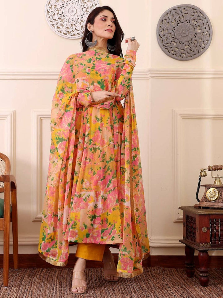 Georgette Floral Printed Flared Anarkali Kurta with Pant and Dupatta (Set of 3)