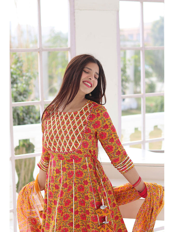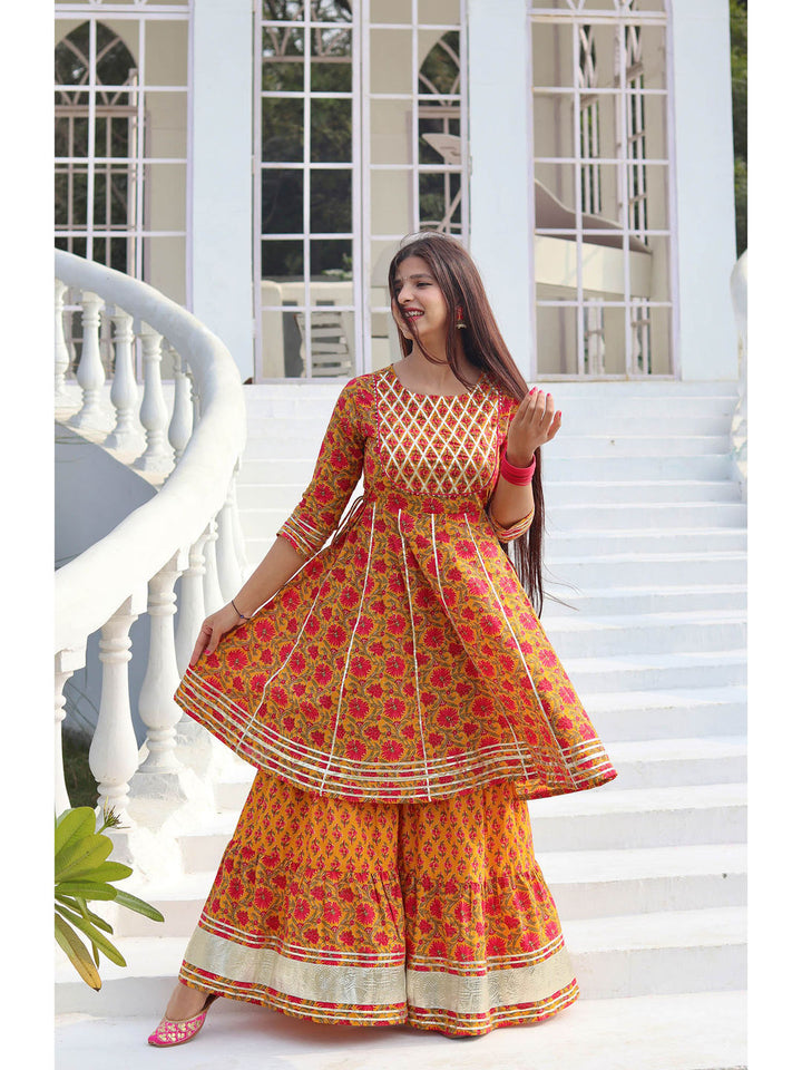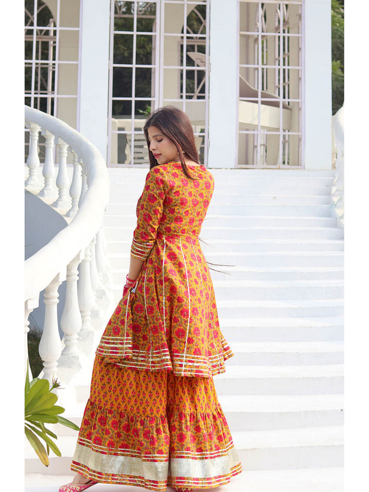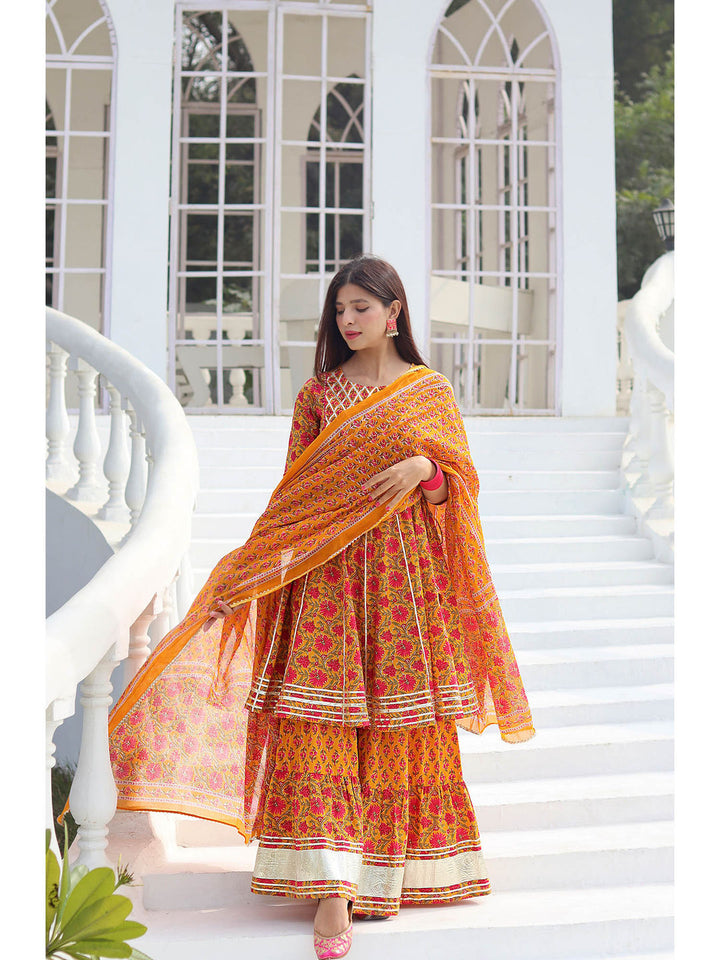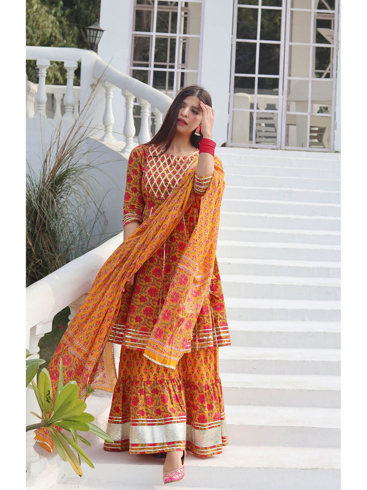 Mustard Hand Block Cotton Kurta Sharara with Dupatta (Set of 3)