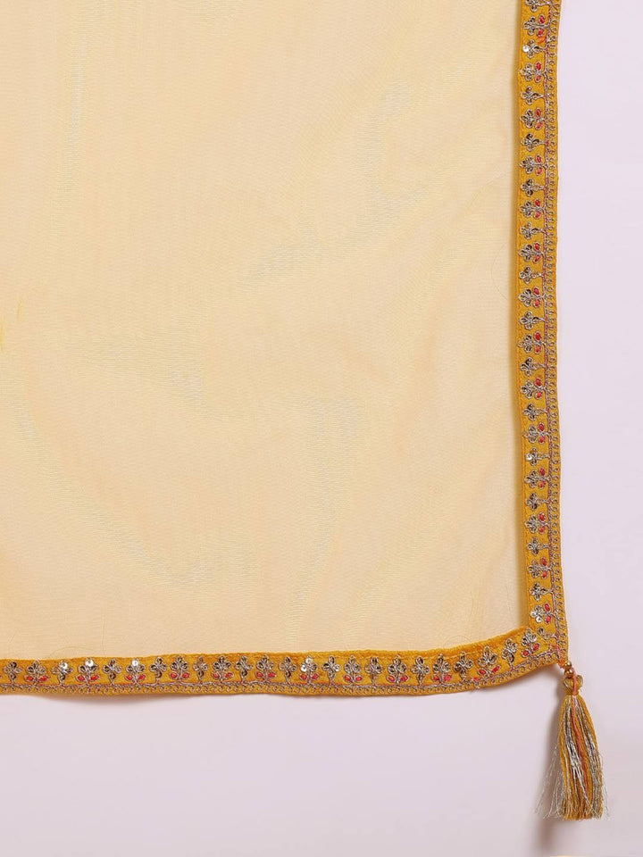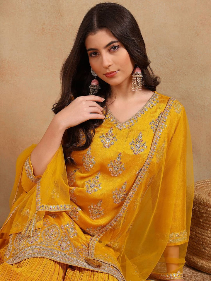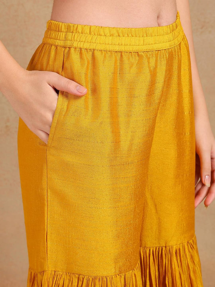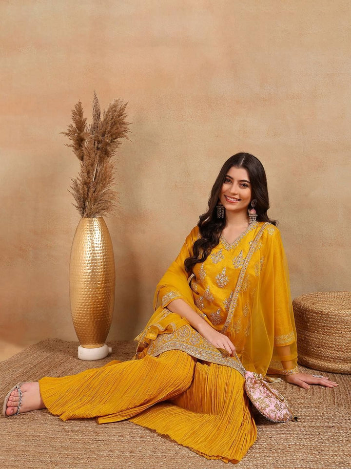 Mustard Silk Blend Embroidered Straight Kurta Sharara with Dupatta (Set of 3)