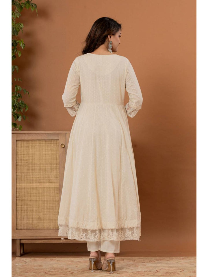 Off White Mirror Thread Work Anarkali Kurta with Pant & Dupatta (Set of 3)