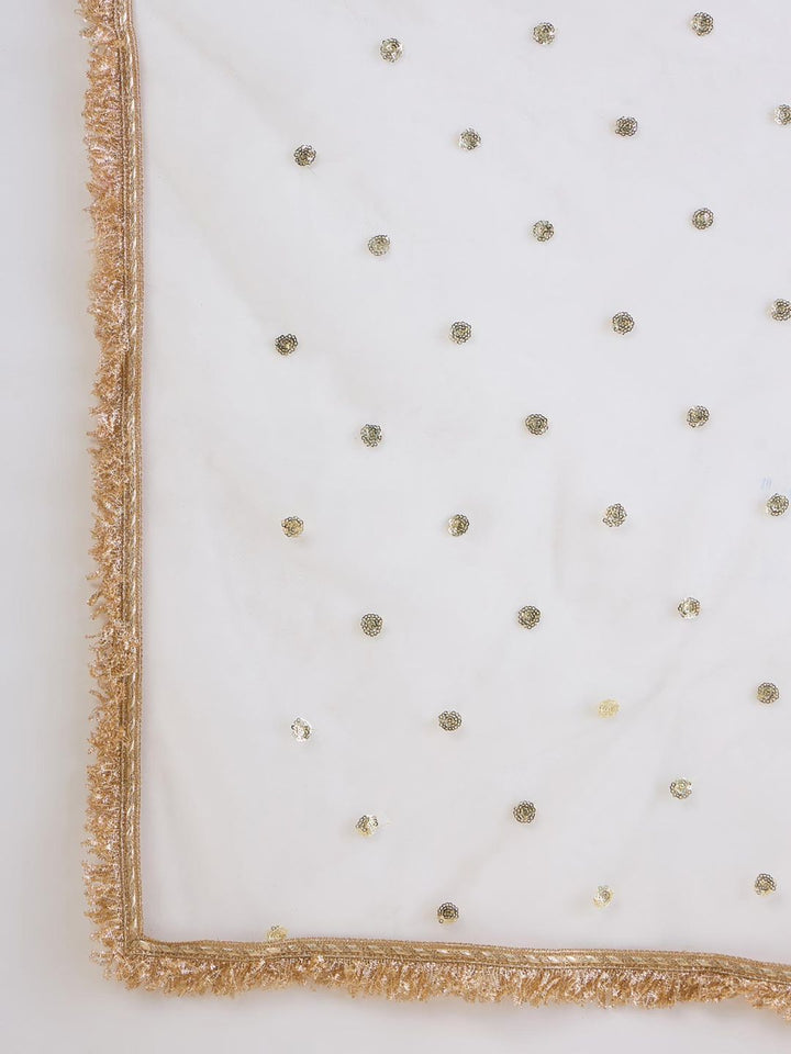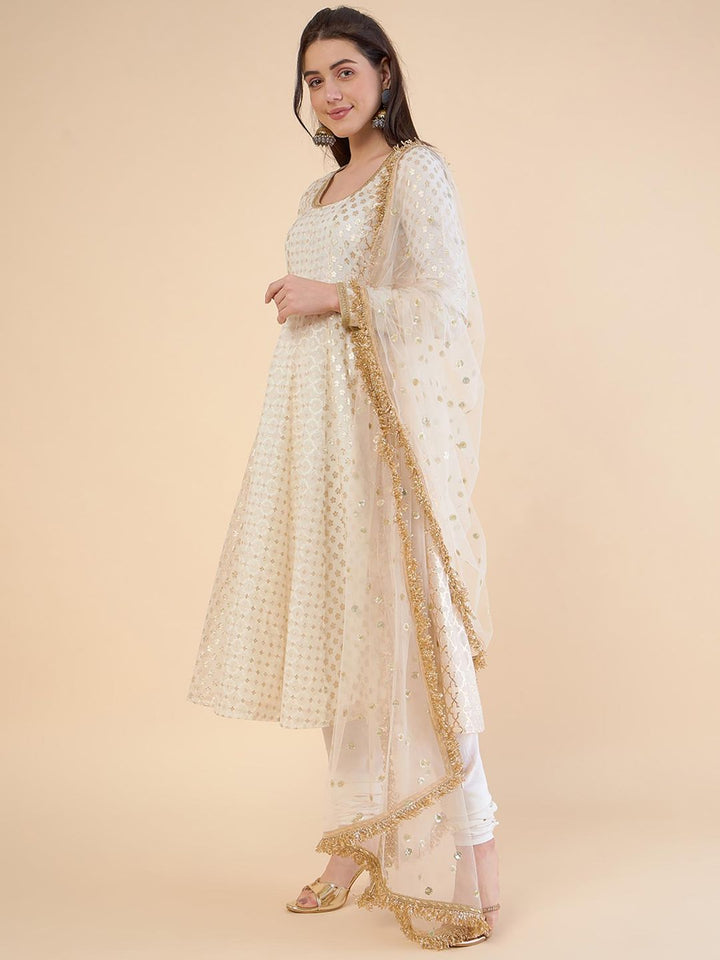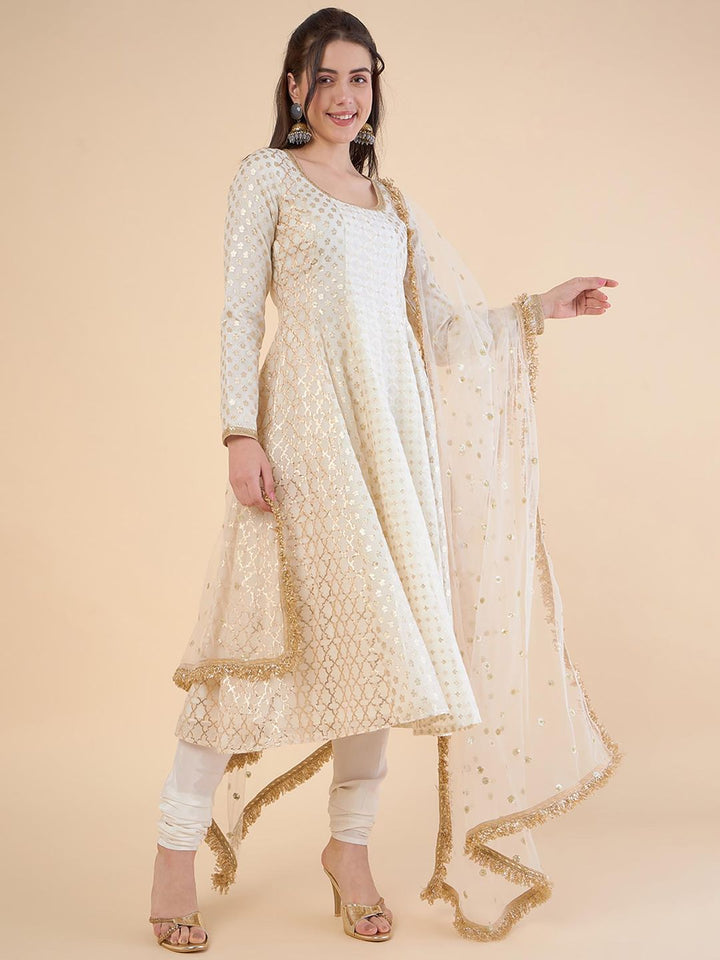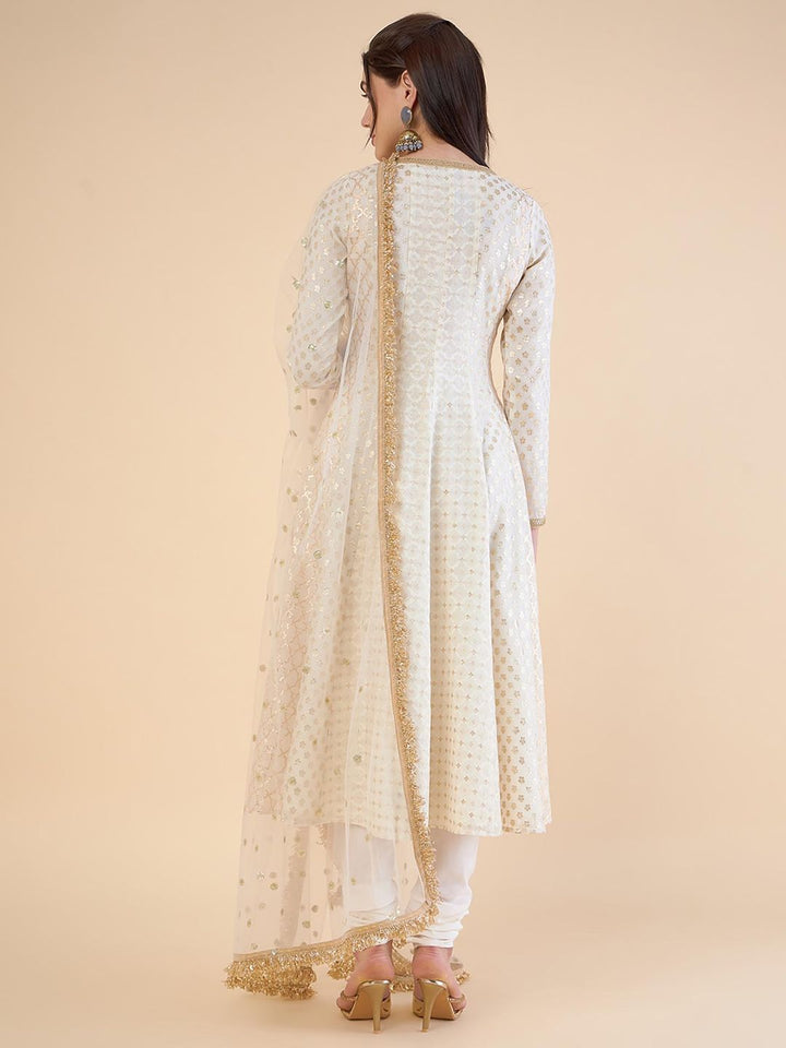 Off White Women Sequinned Chanderi Cotton Kurta with Churidar and Dupatta (Set of 3)