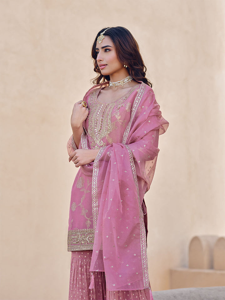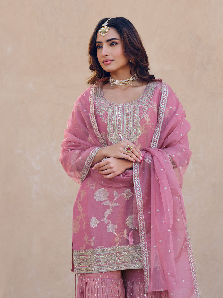 Pink Embroidered Kurti with Sharara and Dupatta (Set of 3)