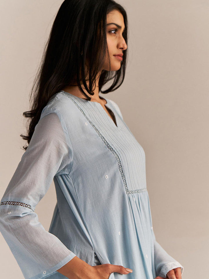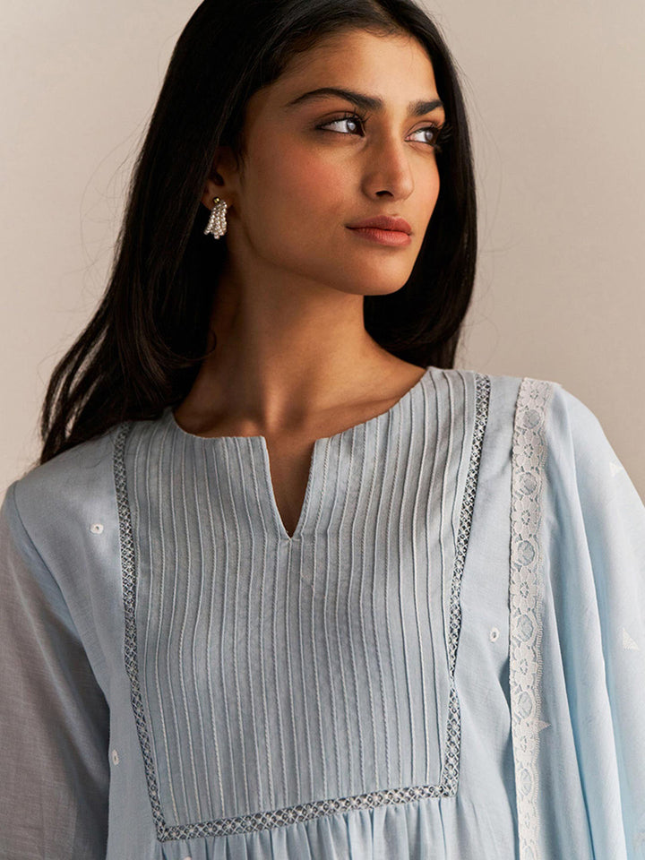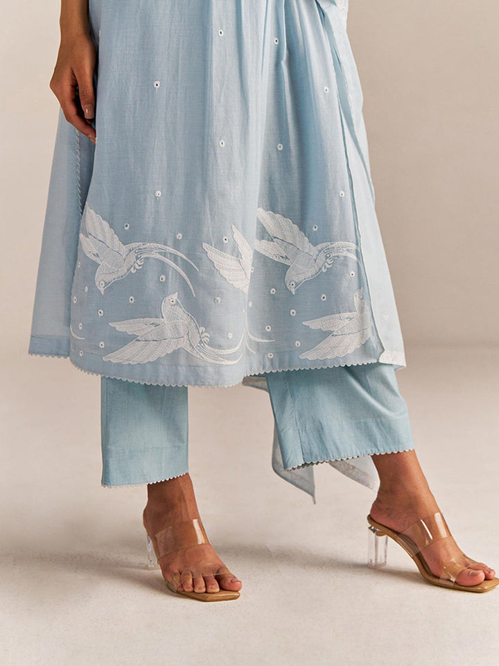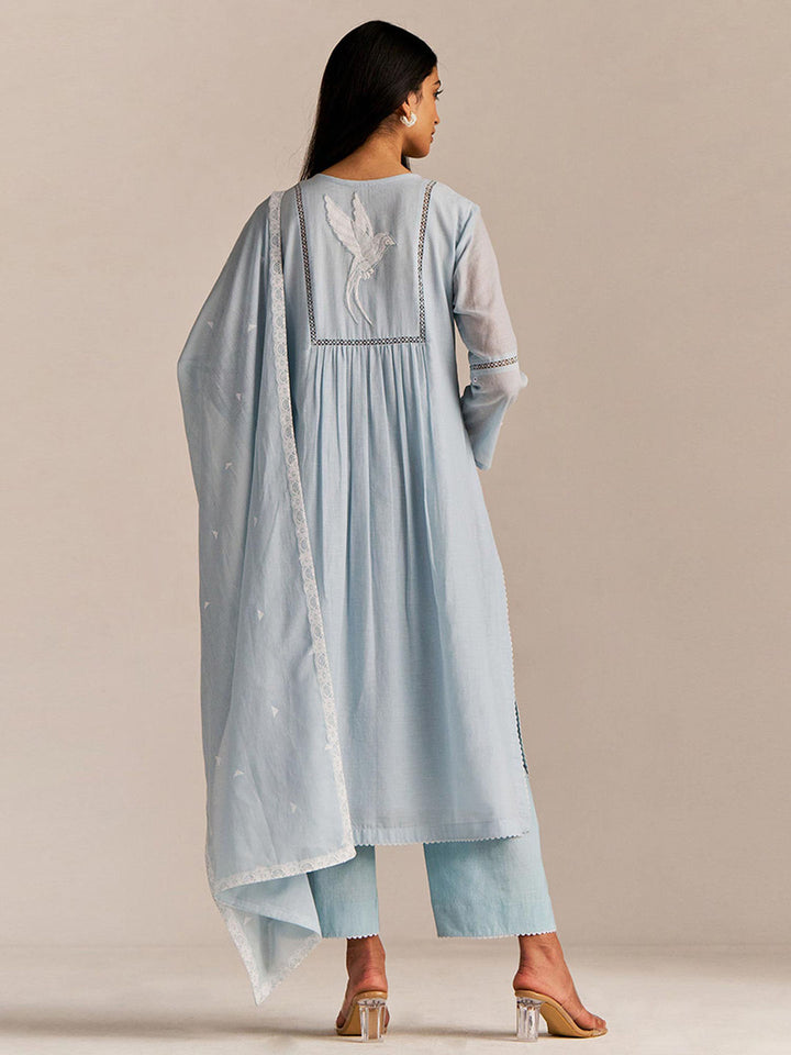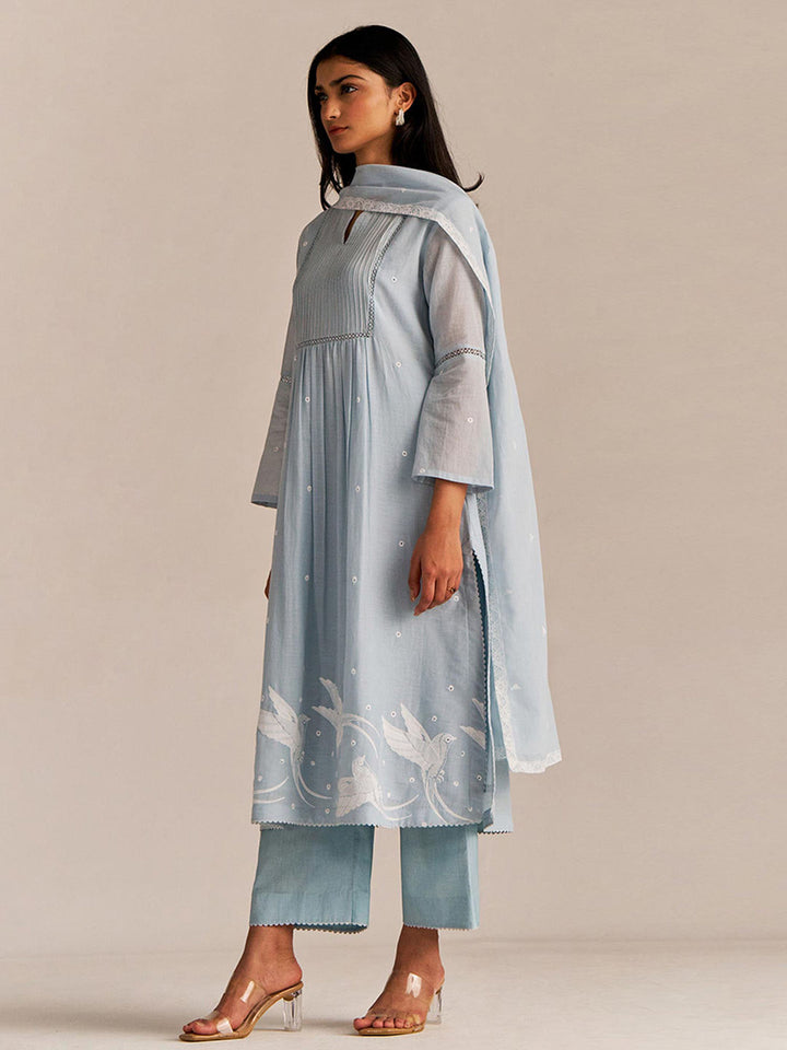Powder Blue Mul-Mul Embroidered Kurta with Pant and Dupatta (Set of 3)