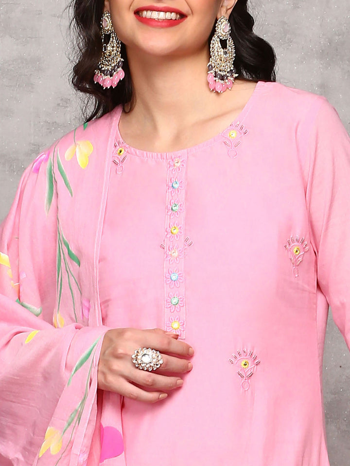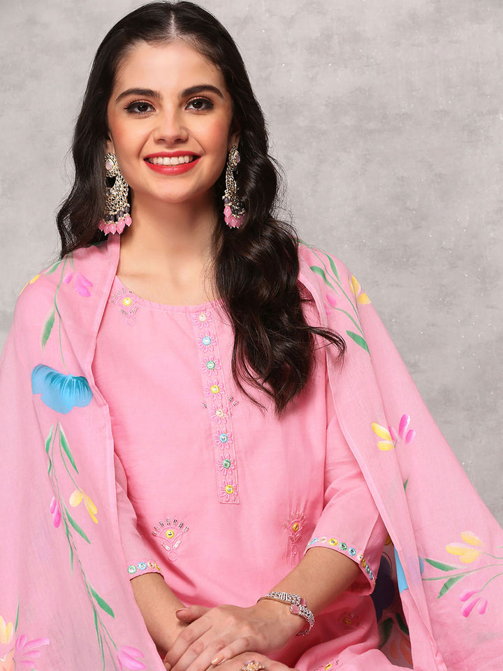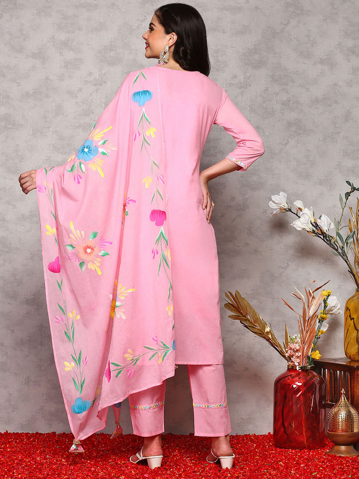Women Cotton Embroidered Pink Kurta with Pant and Dupatta (Set of 3)