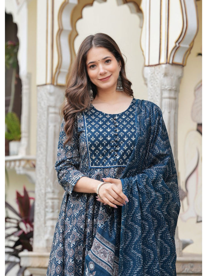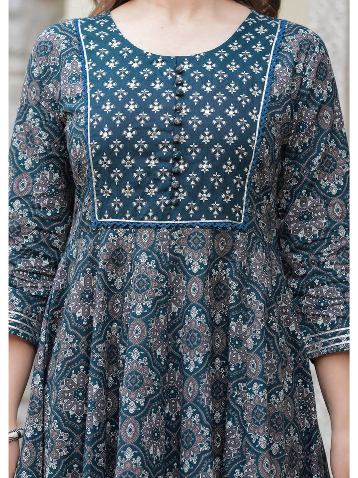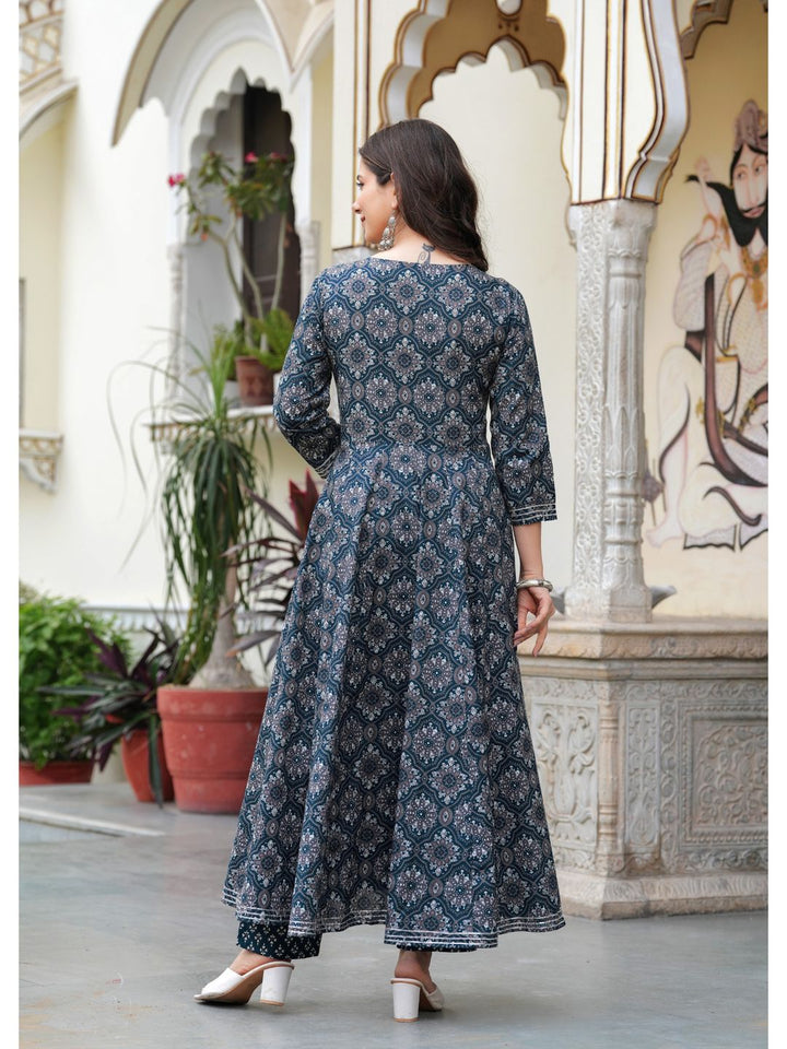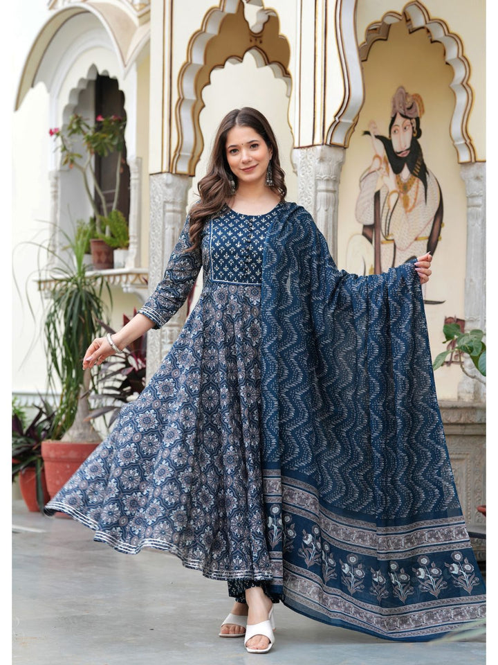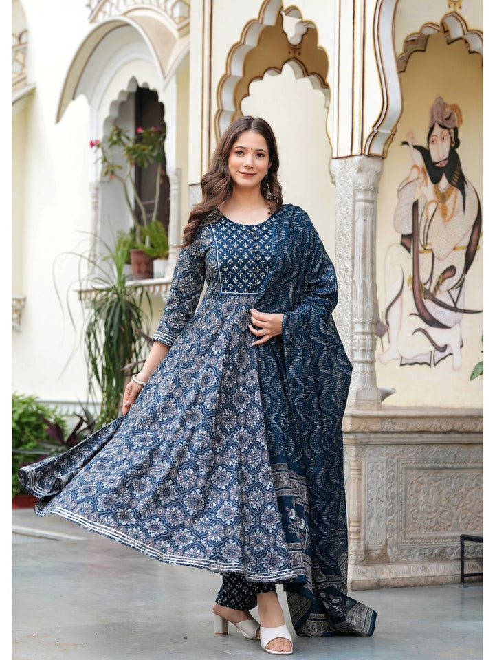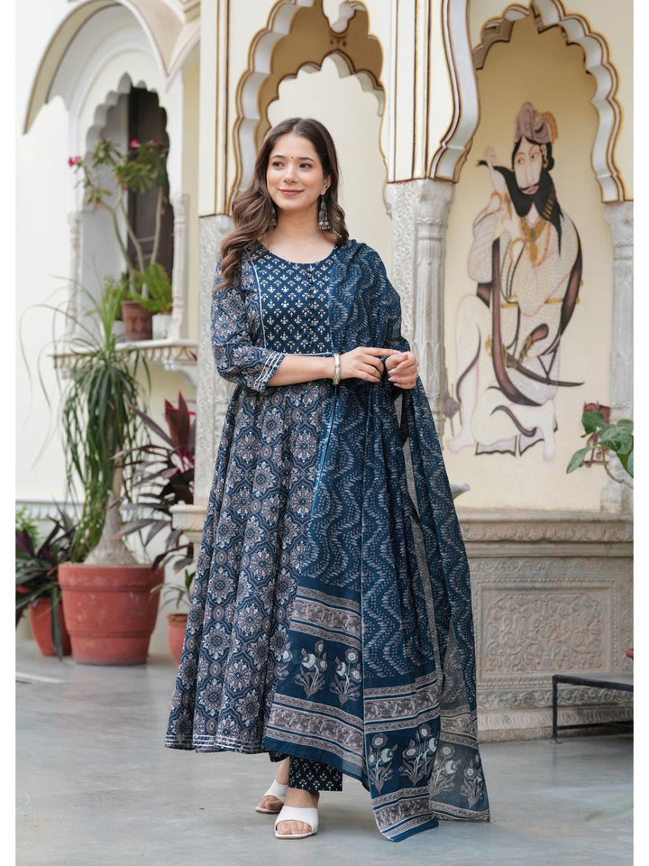 Women Cotton Printed Round Neck Anarkali Kurta and Pant with Dupatta (Set of 3)