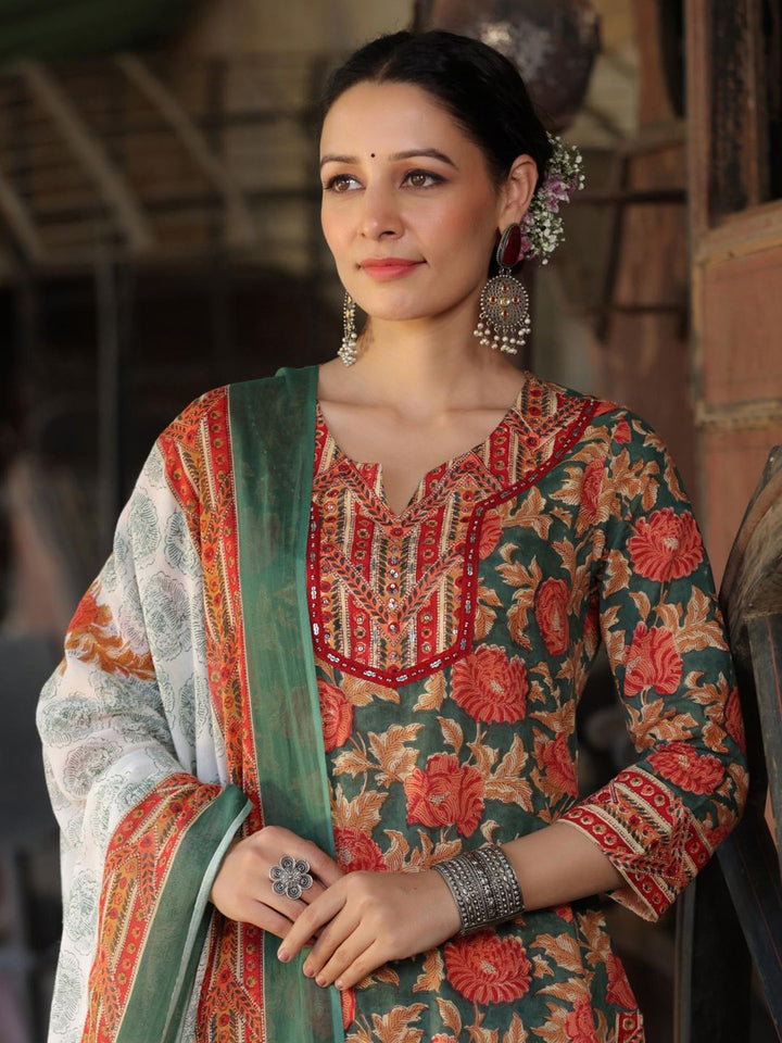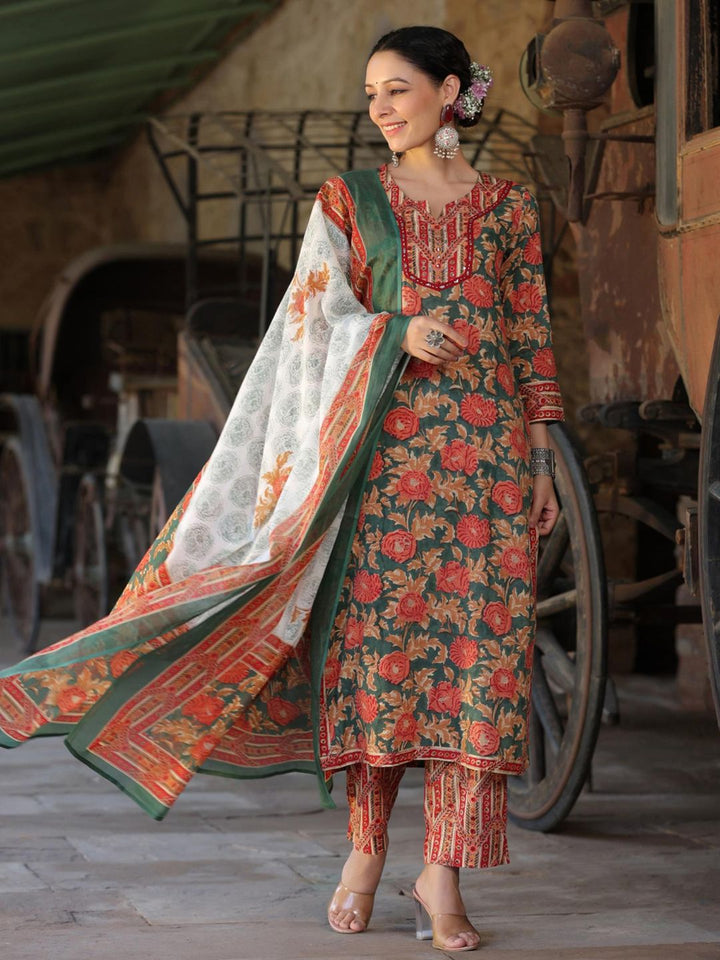 Women Green Floral Pure Cotton Straight Kurta with Pant & Dupatta (Set of 3)